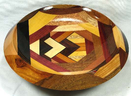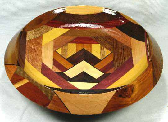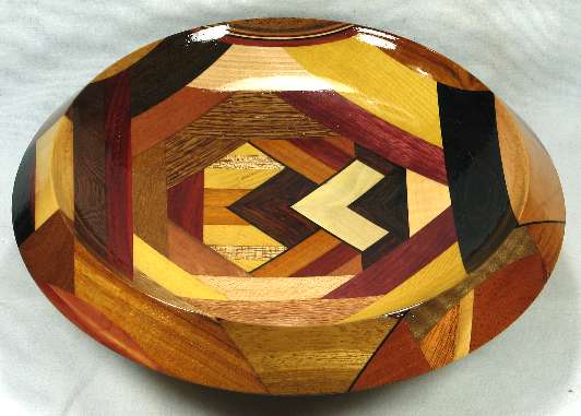 view 5: pine over cocobolo over wenge over cowtree over ebony veneer over yellowheart, all backed by panga panga then padauk, ipe, padauk, BOX. On the left and right are wedges of billy webb wood
