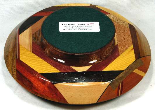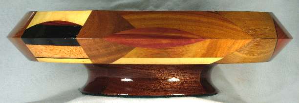 view 8: on the left and right are wedges of mahogany; in the center are two pieces of mahogany split by tulip poplar and off at the right edge of that section is a little lamination of aromatic red cedar thin, bubinga veneer, ash thin, bubinga veneer, aromatice red cedar, and then a tiny wedge of paela. All of that backed by oxhorn and then ebony veneer, osage orange, machiche, BOX