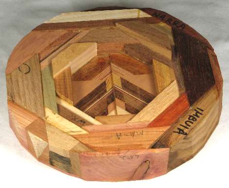 BOX: bottom up; beech, sycamore sided by cocobolo, cocobolo sided by ?(dark brown wood), aromatic red cedar thin, ebony veneer, holly veneer, maple veneer, thick walnut veneer, osage orange sided by cocobolo with makore above the cocobolo, aromatic red cedar thin, maple veneer, padauk veneer, aromatic red cedar thin, maple veneer, mahogany veneer, maple veneer, aromatic red cedar thin, holly veneer, mahogany veneer, maple veneer, cocobolo