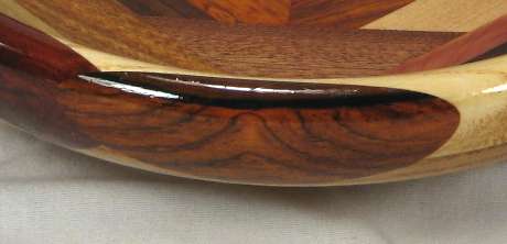 The cocobolo in view 5 has a color change that is so strong and abrupt, with a thick black line between the two colors, that it seems to be two different woods. Also, that same piece of cocobolo has a marvelous "V" shape in the grain. There's a closeup pic below showing both of these characteristics clearly.