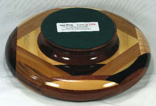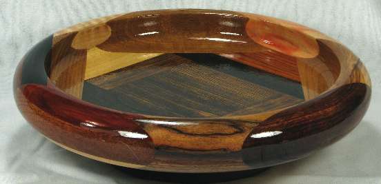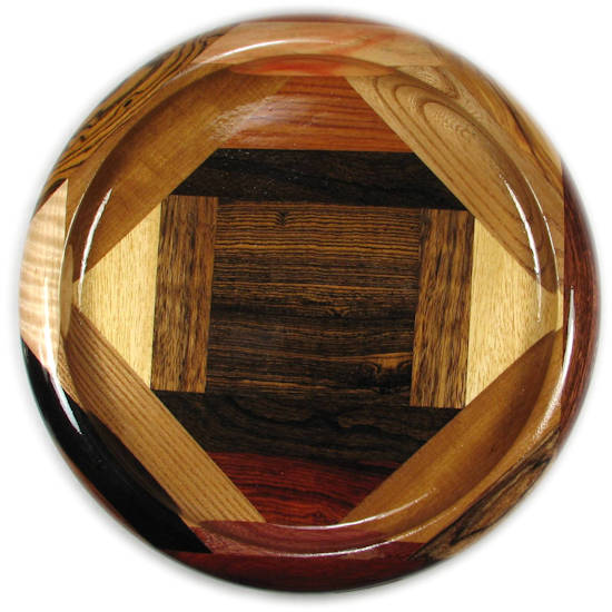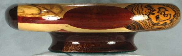 I ALWAYS POINT OUT ANYTHING THAT NEEDS TO BE COMMENTED ON. THESE ARE (UNLESS OTHERWISE STATED) THINGS THAT DO NOT DETRACT FROM THE BEAUTY OF THE BOWL, BUT I WANT TO BE SURE I GIVE A COMPLETE DESCRIPTION. SO ... the chechem on the right has several cracks. I knew that when I selected the piece --- it's just such a gorgeous piece of that species that I couldn't resist using it even though I knew the cracks would show up. The bocote in the center developed a hairline crack after the bowl sat on the shelf for a while. It is very thin and you can't see it unless you get the light to reflect directly off of that area of the bowl and it is only lightly perceptible to the touch. The olive in view 4 has a natural crack that shows up as a dark line (it is also slightly perceptible if you run your fingernail over it)