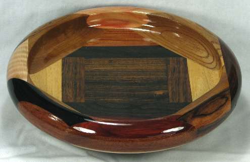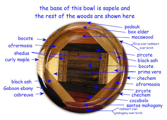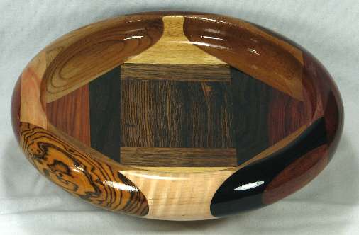 Unfortunately, the box elder in view 5 has nice red streaking only on the bottom of the bowl and just some light pink tint on the top. The bocote on the left side is excellent, as is the ebony in the lower left (the white section at the bottom of the ebony is not sapwood, it's a thin layer of birch veneer).