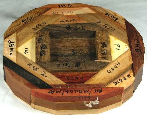 COMMENTS: The bocote in the middle has an interesting gradation of growth rings from very narrowly spaced at the bottom to considerably wider at the top. It is possible that this occurred because of differences in yearly growth but it is much more likely due to the piece being rift cut.