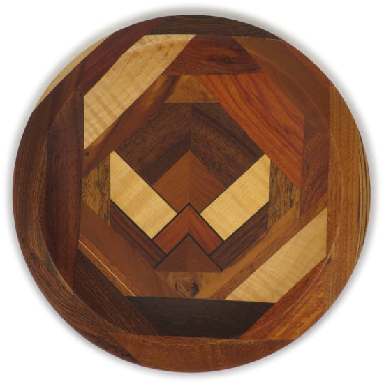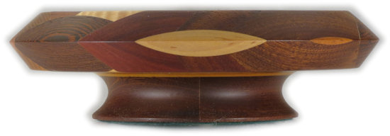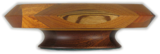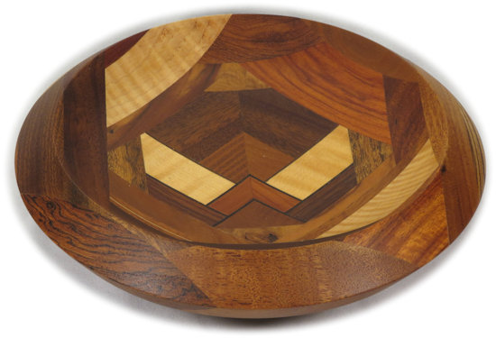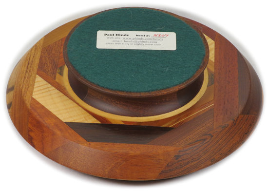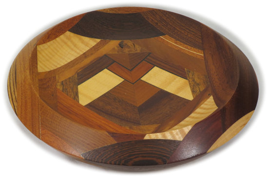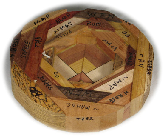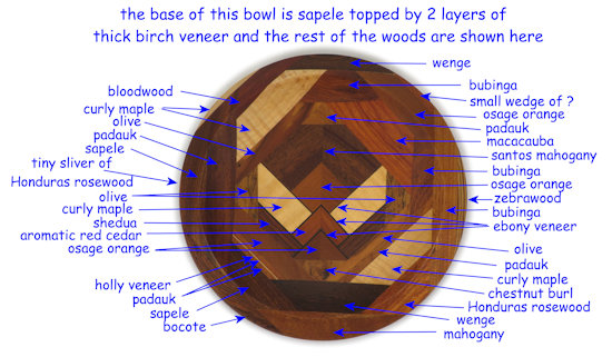 COMMENTS: very nice, sharp, clean middle; I like the way the double-thick ebony veneer sets off the woods there and how there's a good color contrast because of it. Because of the way it's cut/turned, the zebrawood on the right outer rim shows a quartersawn face on the upper rim and a flat cut face on the lower rim and likewise the wenge on the top outer rim shows a flat cut face on the upper rim and a quartersawn face on the lower rim. People who are not wood aficionados won't care much about that but I point it out for those who are. Contrast those to the bocote in on the lower left rim which shows rift cut faces on both the upper and lower rim surfaces.