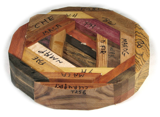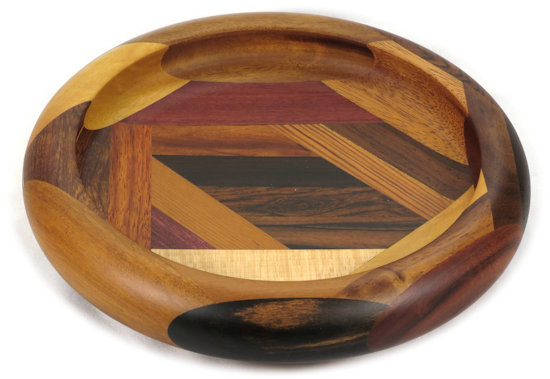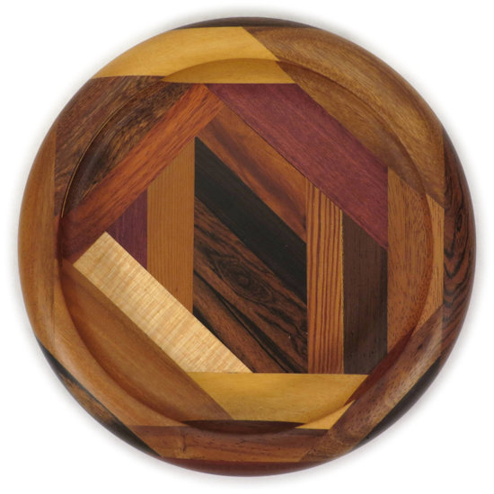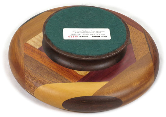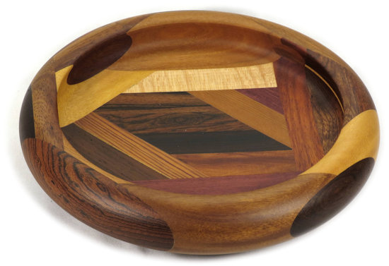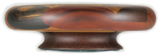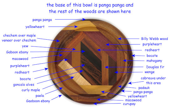 COMMENTS: Excellent woods throughout this one and most of them are relatively heavy species, giving the bowl quite a nice heft. The inside rim has several nice omega curves. The curupay at the bottom has the best streaking of any I've encountered in my admittedly limited experience with that wood; also, it is chatoyant and the two combined make it, to my mind, an outstandingly beautiful wood. The purpleheart at the upper right is both lightly curly and lightly chatoyant