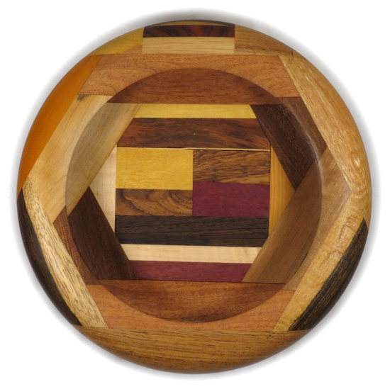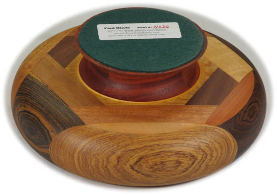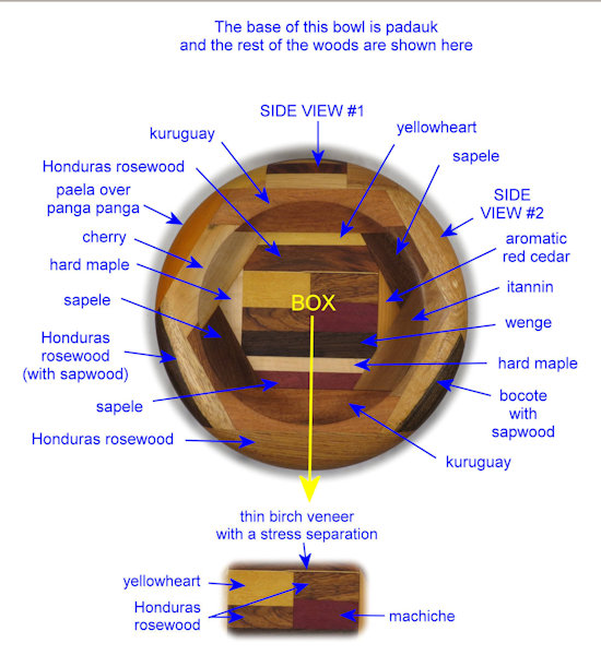 There is a thin stress separation between the bottom piece of kuruguay and the sapele that is above it. This is shown in an accompanying image. You can see it (though it's not very obvious looking at the top --- more so on the bottom) and you can feel it when you run your finger along the top or bottom. There is a more visible stress separation along the thick piece of birch veneer in the middle of the bowl. Weirdly, it separates on top on the left side but on the bottom of the right side. This one is visibly obnoxious and because of it I have priced the bowl much lower than I otherwise would.
