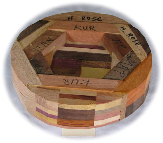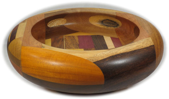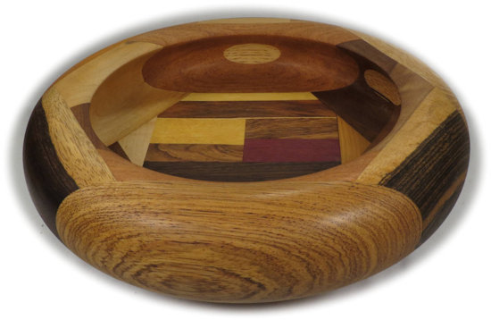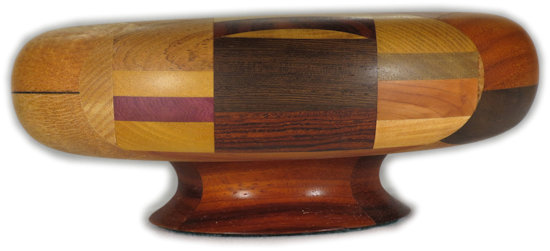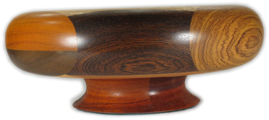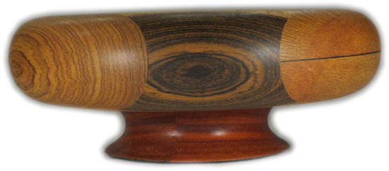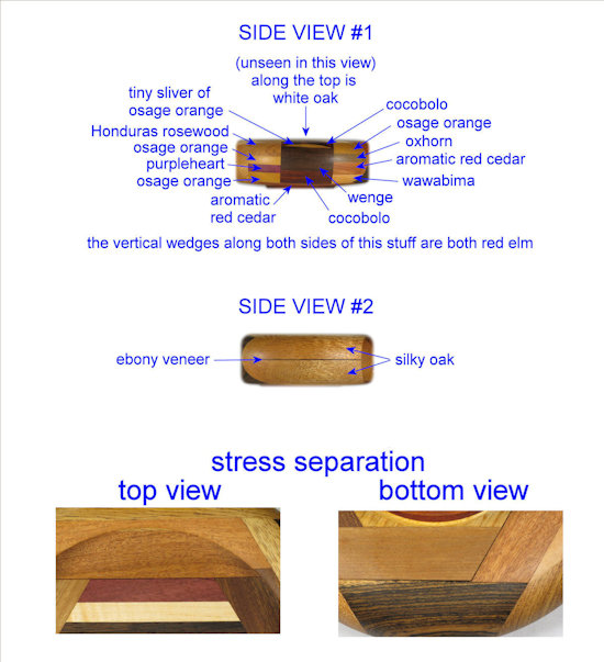 COMMENTS: The woods around the rim are all quite nice but the curly paela along the upper left is particularly pretty. I really like the way the ebony veneer set off the two pieces of silky oak in side view #2.