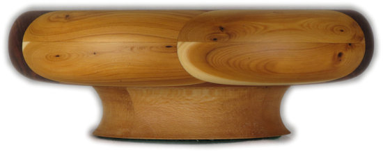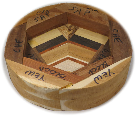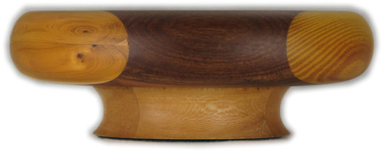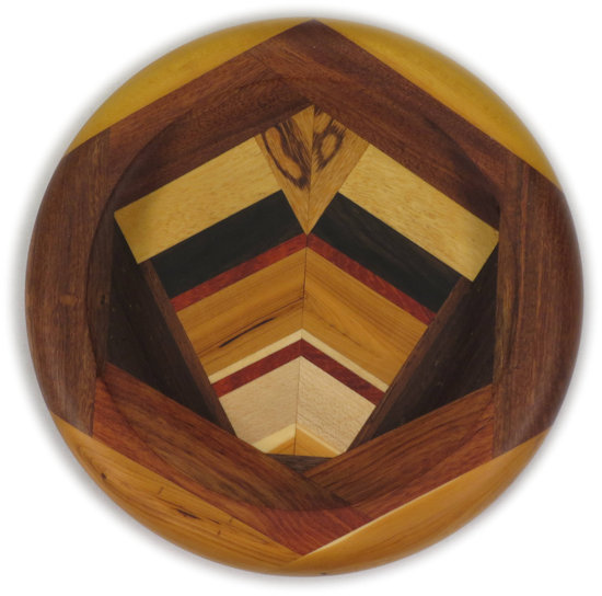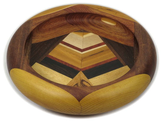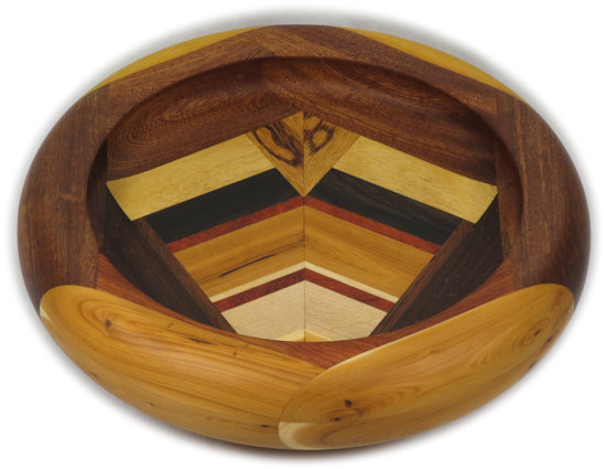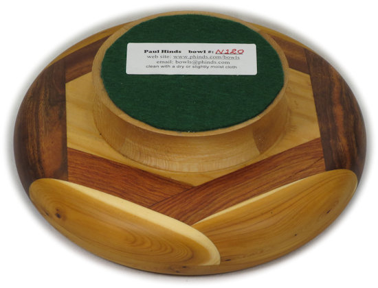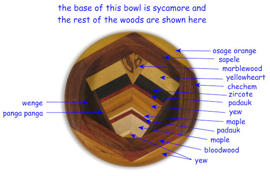 I ALWAYS POINT OUT ANYTHING THAT NEEDS TO BE COMMENTED ON. THESE ARE (UNLESS OTHERWISE STATED) THINGS THAT DO NOT DETRACT FROM THE BEAUTY OF THE BOWL, BUT I WANT TO BE SURE I GIVE A COMPLETE DESCRIPTION. SO ... the yew pieces in the very middle have a crack and in the one one the left it's quite noticeable. The yellow pine veneer under the middle section completely hides the woods of that area when the bowl is viewed from the bottom. The yew pieces in the bottom rim have lots of little branch inclusions which is normal for yew.