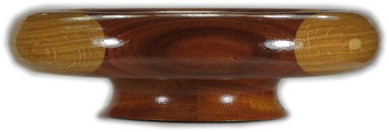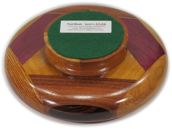 I ALWAYS POINT OUT ANYTHING THAT NEEDS TO BE COMMENTED ON. THESE ARE (UNLESS OTHERWISE STATED) THINGS THAT DO NOT DETRACT FROM THE BEAUTY OF THE BOWL, BUT I WANT TO BE SURE I GIVE A COMPLETE DESCRIPTION. SO ... the Senegal rosewood in the lower right has an almost unnoticeable stress separation that cannot be seen but which can be felt (although barely) along the lower curve.