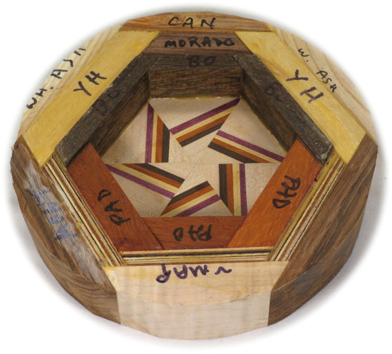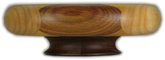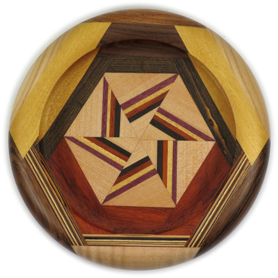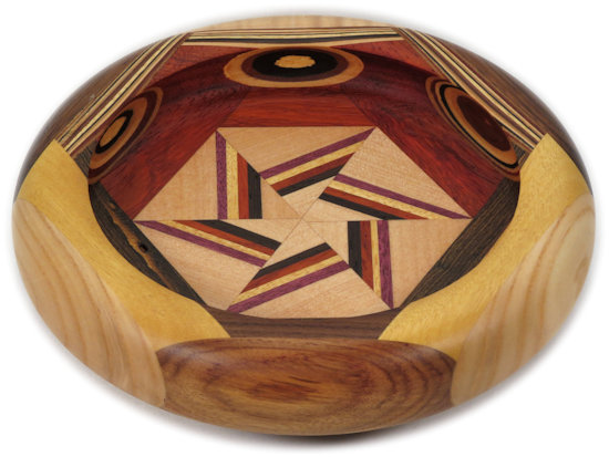 COMMENTS: One of my better efforts, I think. Nice clean lines and contrasting bold colors. I particularly like the omega curves with embedded ovals and have shown a pic at the bottom of this page showing them in closeup. The pinwheel in the middle turned out particularly well, with the maple showing lots of little tiny ray flakes. I think the contrasting colors in the thin-wood laminate worked really nicely.