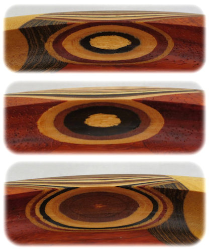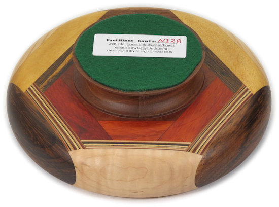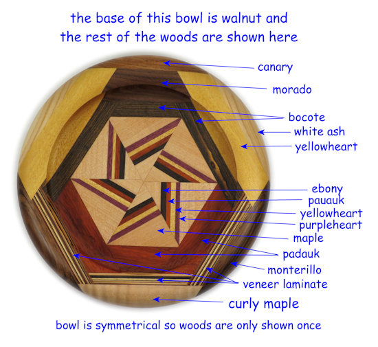 I ALWAYS POINT OUT ANYTHING THAT NEEDS TO BE COMMENTED ON. THESE ARE (UNLESS OTHERWISE STATED) THINGS THAT DO NOT DETRACT FROM THE BEAUTY OF THE BOWL, BUT I WANT TO BE SURE I GIVE A COMPLETE DESCRIPTION. SO ... there is a small void in the piece of bocote at the right of center. This is the kind of thing that happens with wood, it being an organic material, and I don't consider it significant but since you might not agree I want to be sure you are aware of it. You can see it easily in the enlargement of the orientation view