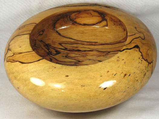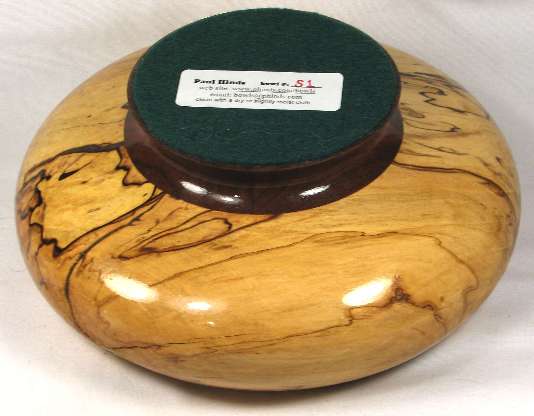 NOTE: as you can see from the bowl blank below, this wood is natually near-white and the application of the natural stain and polyurethane causes a strong shift to yellow. This is unavoidable with maple, although it is my understanding that there is at least one special finish that has a greatly reduced yellow shift. I don't work with solid woods much and have not explored that option. I find both the original white and the final yellowish tan attractive so while I do not like to cause significant shifts in the color of wood this one just has to be an exception.