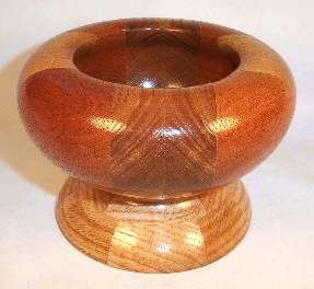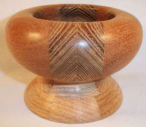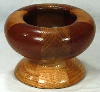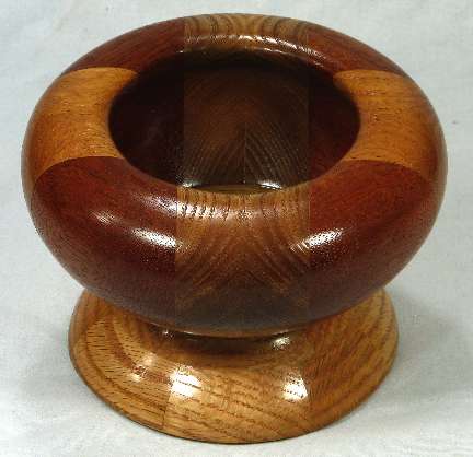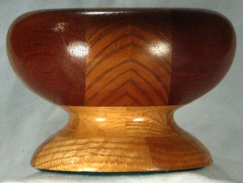 comments: This was one of my earliest bowls and was an experiment in end-grain turning and was finished before I started using poly with a UV blocker. I think it turned out really well, except for the slight "muddying" of the end grain lines by the polyurethane, which I did not expect. It sat on a shelf for years with no UV blocker and the woods have darkened from their original color, as you can see in the pics below.