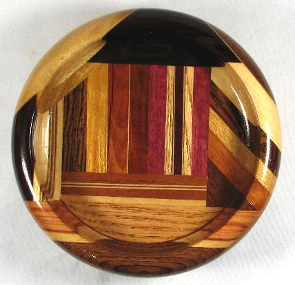 view 6: tiny oval of mahogany, yellowheart (obeche?), unknown golden yellow wood, BOX