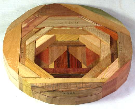 comments: The olive at the bottom has some nice dark streaking and the tulip poplar in the upper right has an unusually dark green color due to mineral staining (and was chosen for that reason).