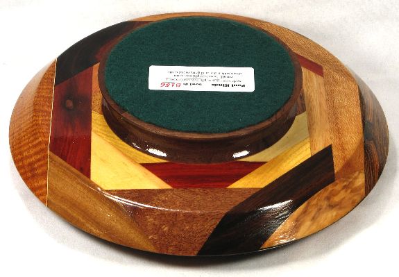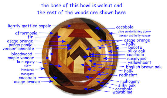 I ALWAYS POINT OUT ANYTHING THAT NEEDS TO BE COMMENTED ON. THESE ARE (UNLESS OTHERWISE STATED) THINGS THAT DO NOT DETRACT FROM THE BEAUTY OF THE BOWL, BUT I WANT TO BE SURE I GIVE A COMPLETE DESCRIPTION. SO ... The redheart in view 7 has a wormhole on the bottom, of the type that fills back up with what seems to be soft powdery wood. The dark cocobolo in view 8 has a poor glue joint on the bottom of the bowl; it isn't particularly noticeable visually but you can feel it when you run your finger over the joint on either the top or the bottom of the bowl.