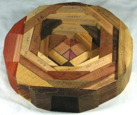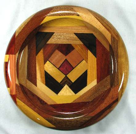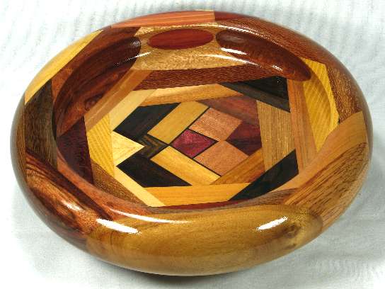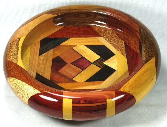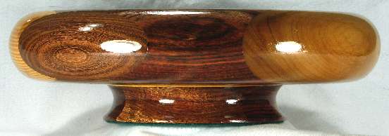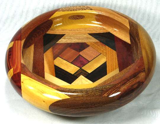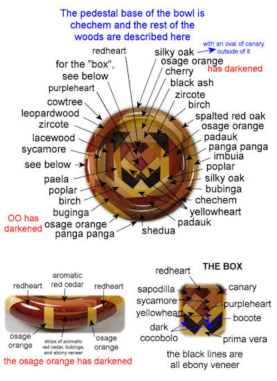 comments: I really like the way the ebony veneer in the box sets off the other woods. The oval of canary at the top on the outside of the rim has nice red streaks and the imbuia sapwood on the right side rim has a very attractive grain pattern. Several of the woods in this one are nicely chatoyant including the imbuia on the right side rim, the shedua at the bottom, the canary on the outside of the top rim, the chechem in the lower right and both the osage orange and the bubinga in the lower left and several others.