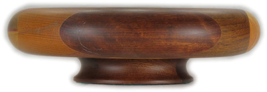 I ALWAYS POINT OUT ANYTHING THAT NEEDS TO BE COMMENTED ON. THESE ARE (UNLESS OTHERWISE STATED) THINGS THAT DO NOT DETRACT FROM THE BEAUTY OF THE BOWL, BUT I WANT TO BE SURE I GIVE A COMPLETE DESCRIPTION. SO ... The chechem on the lower rim has a pair of adjacent cracks on the lower left side. The larger of them is obvious to the touch. This is not a stress fracture, it is an internal flaw in the wood --- it just happens sometimes since wood is an organic material and this piece of chechem is so spectacular that I would have used it even if I had known in advance that the cracks were there. The osage orange in the lower left also has a significant crack of the same kind. Again, these are wood characteristics, but still, I've dropped the price from $150 to $125 because of them.