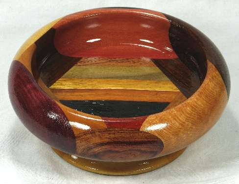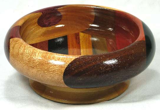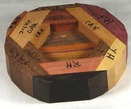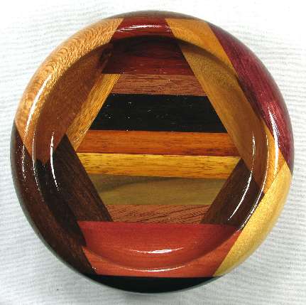 comments: Although the canary wood in view 4 does not have any of the red streaking that canary sometimes has, it is highly chatoyant. The African blackwood in view 1 is almost as black as it looks in the pics, but in a good light, you can make out the grain pattern. Nice woods throughout and a nifty little bowl.
