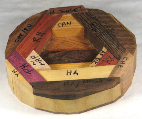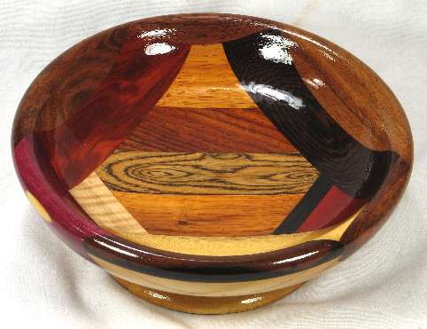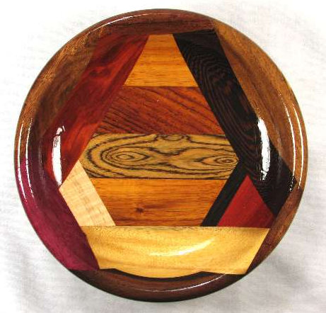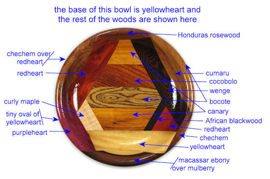 flaws/issues: The glue line between the canary and the bocote in the middle has a gap that shows on the surface. I can see it in the high-resolution large image of the bowl blank so I know it's not a stress separation, but I don't know how I ever allowed it to happen in the first place.