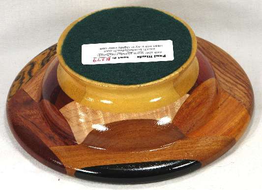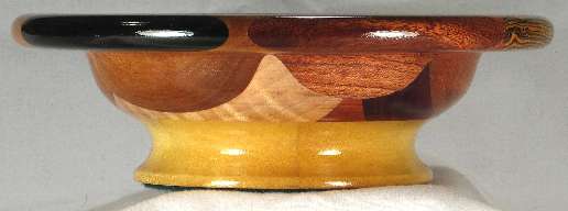comments: Very nice woods throughout this one including several that are at least lightly chatoyant. I'm very pleased with the choice of yellowheart for the base on this one as it gives a nice light appearance to this bowl, aided somewhat by the small size, plus this particular cut of yellowheart is nicely chatoyant