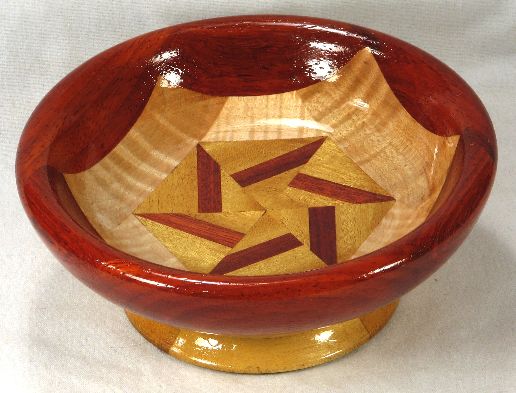 all of the red wood around the outside is padauk and all of the off-white wood inside the padauk is curly maple. In the middle (the BOX) is all yellowheart with darts of redheart