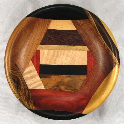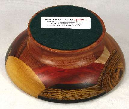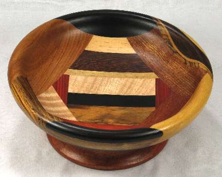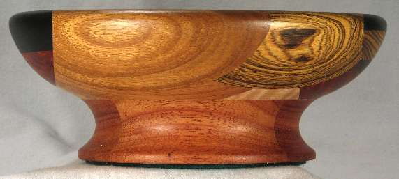 BOX: from the bottom up; bocote, African blackwood, curly maple, yellowheart, panga panga. On both sides are wedeges of redheart.