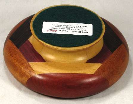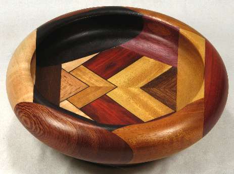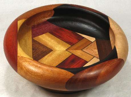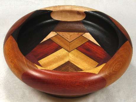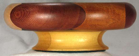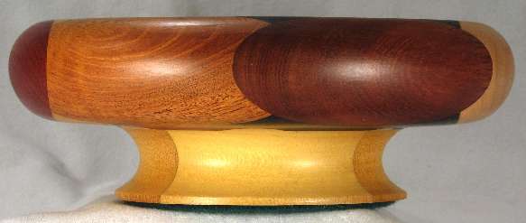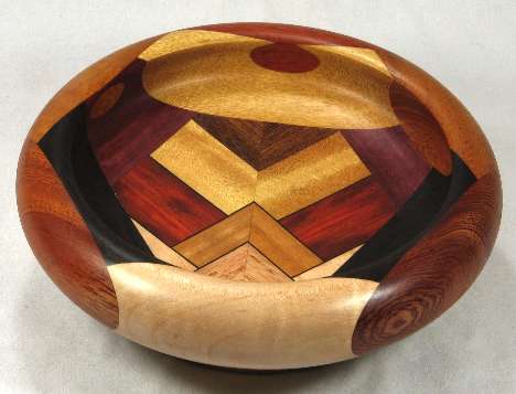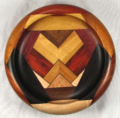 BOX: bottom up; wormy red oak, ebony veneer, paela, ebony veneer, yellowheart, panga panga. Slanting off from the paela is redheart and between the redheart and the yellowheart above it is ebony veneer. In the lower left and right corners is basswood with ebony veneer above it.
