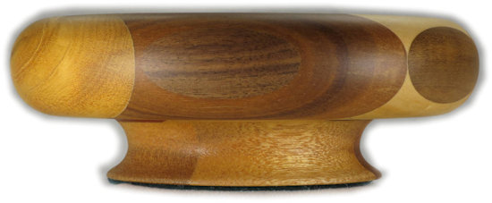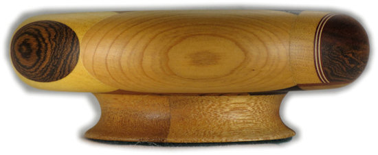 The yellowheart at the bottom is really gorgeous and is very chatoyant even though the flat finish mutes that somewhat. It has an ambrosia bug hole in it with a very small mild stain radiating from it left and right but this is character, not a flaw. Also, yellowheart is normally fairly bland as far as grain goes but this piece has a nice swirly grain (it was likely at or near a crotch). The bocote oval on the top outside rim stands out nicely because of the yellowheart behind it.