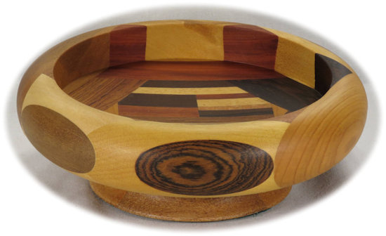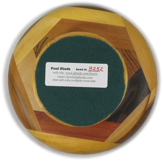 There are a couple of extremely minor rough spots where woods join. There is a tiny chip-out in the middle lower right in the upper right corner of the wenge. There is some very minor chip-out on the bottom edge of the base but it IS noticeable if you are examining the base up close. The only really significant issue is that there is an area of chip-out in the inside of the rim at the upper left where the edge of the wenge meets the cypress. and a sliver of zebrawood shows through. Because of all these issues, I've priced this one quite low.