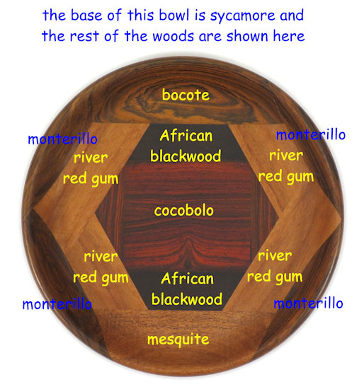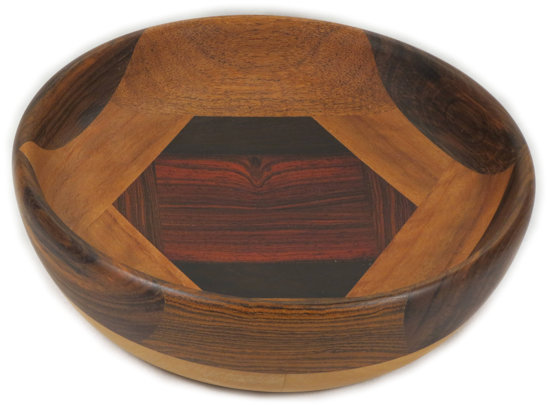 COMMENTS: This bowl sat around my basement for years before I finished putting on the finishing agents and in that time most of the woods darkened a fair amount and I find somewhat to my surprise that I really like the result. The most important things are that the cocobolo in the middle is still beautiful and the grain pattern in the bocote at the top is quite visible. The base is unlike any I've ever done before. Rather than my normal "pedestal base", this one is segmented sycamore that was as wide as the bottom of the blank and was turned to have a continuous curve with the rim of the upper part. I have mixed feelings about how this looks but it does give the bowl some extra heft and certainly adds stability.