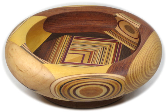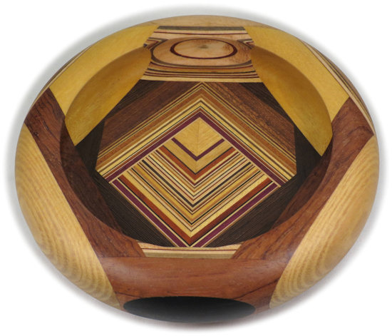 COMMENTS: A small but busy bowl with a lot of laminations that came out just the way I wanted them to except for a minor lack of symmetry between the right outside and the left outside. The black locust pieces at the top left and top right are quite chatoyant although that is somewhat muted by the flat finish.