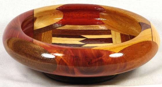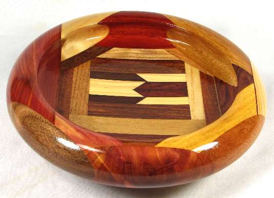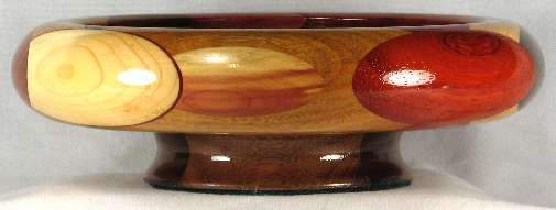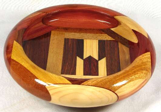 flaws/issues: There is a hairline stress separation at the right of the BOX, another at the maple veneer/mahogany joint in view 1, and another at the canary/oak joint in view 2. These can be both seen and felt and are the cause of the low price on the bowl.