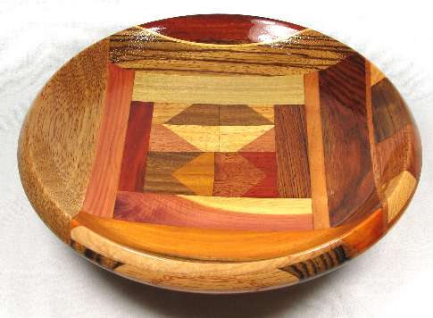 BOX: on the bottom is aromatic red cedar and on the top is Honduras rosewood. On the left side is tulip poplar and on the right side is aromatic red cedar with sapwood. In the middle are 4 vertical sections of wedges as follows from the left to right: (1) ? (brown wedges) with canary above and below, (2) prima vera with sapele above and below, (3) padauk over ? over mahogany over ? (shedua?), (4) same as (3) but mirrored.