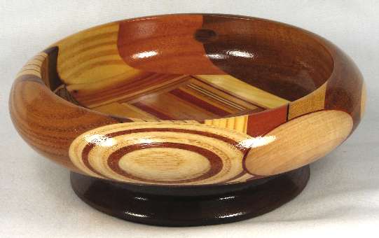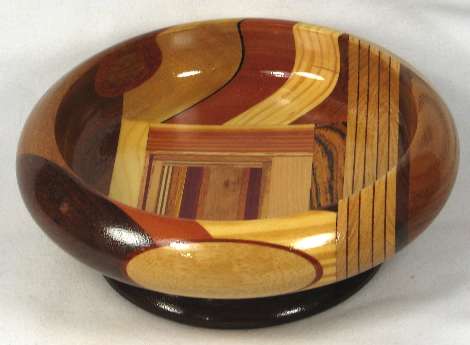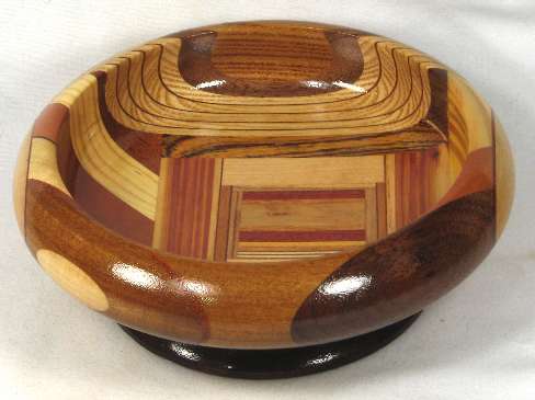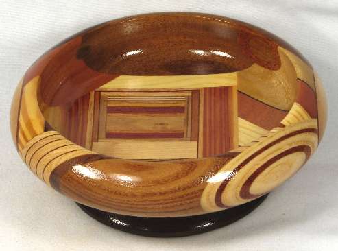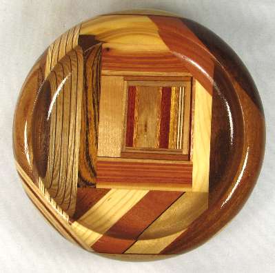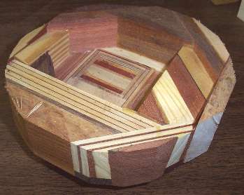 view 1: hard maple, padauk veneer then slanted woods from the left are mahogany, pine, ?, ebony veneer, and yellowheart and after the slants, the BOX