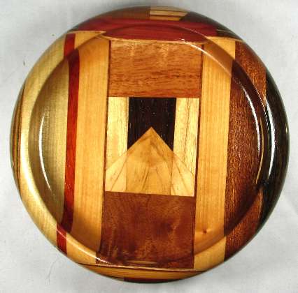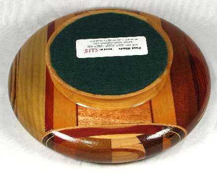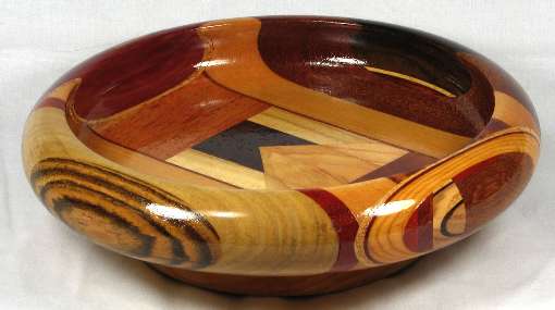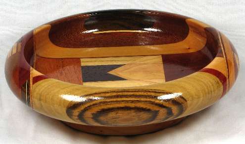 comments: I think the tiny oval of mahogany in view 2 would have been better off on the shop floor as a shaving, but I must not have thought so when it was on the lathe. Note how all three large pieces of mahogany are significantly different from each other. I don't generally keep track of mahogany subspecies, but I believe that the view 5 piece is African, the view 1 piece is Honduran, and I'm not sure about the view 3 piece; probably one of the many African species since it looks somewhat like sapele. The sycamore pieces in this bowl are very NON-flaky --- so much so that they almost don't look like sycamore, but I think they were a good choice for the contrasts in this bowl.
