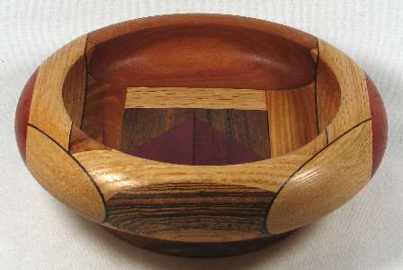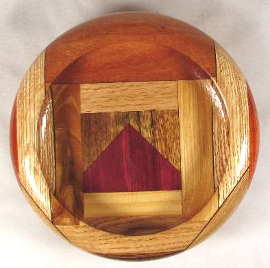 The padauk pieces in views 3 and 7 have darkened to a deep blood red and the purpleheart in the BOX has darkened some as well. The machiche in view 5 has darkened slightly. Despite the minor stress separations and the color changes it is outstanding because of the omega curves inside the rim and the ovals on the outside of the rim most of which are are very nicely delineated by ebony veneer