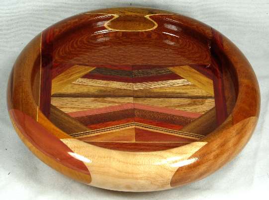 COMMENTS: The curly maple at the bottom looks better in reality than it does in the pics. There are several omega curves inside the rim. Aside from the unfortunate edge tearout, the lacewood at the top is very nice and there are a number of other excellent woods in this bowl. The flawed bocote at the top has ray flakes, which is the reason it was used in the rim.