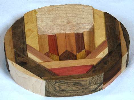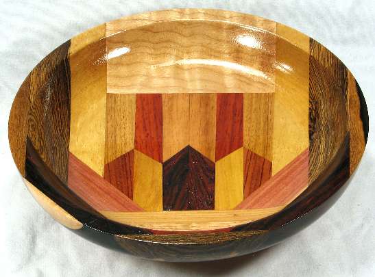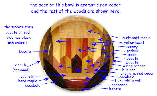comments: The soft maple at the top shows some nice ray flakes on both the inside and outside at the point of maximum curvature. The ray flakes in the oak at the bottom middle show up really well and I wish I had used a wider piece. The paela in the upper section of the middle is a weak color for the species. All of the cocobolo is a very dark purple variety (these particular pieces come from Guatemala). Both pieces of bocote have a very nice dense grain pattern. Both pieces of zircote ended up with too much sapwood (on the left side it's ONLY sapwood).