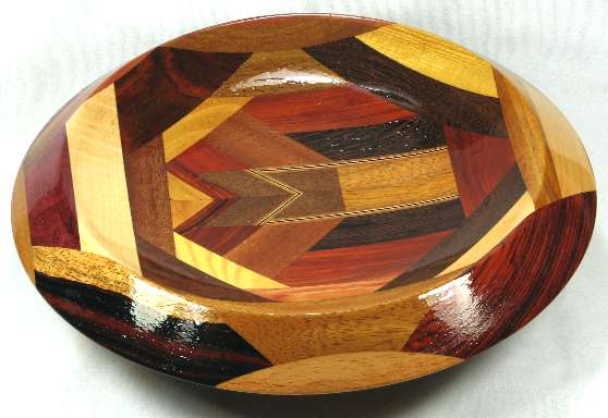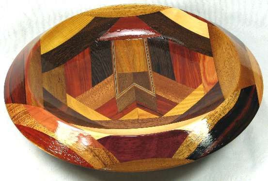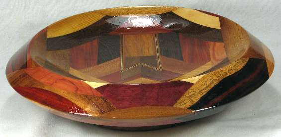 COMMENTS: A very attractive bowl if I do say so myself, with many excellent woods and good contrast and a fairly symmetrical design. Very hefty because this particular shape retains a lot of wood.