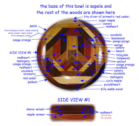 I ALWAYS POINT OUT ANYTHING THAT NEEDS TO BE COMMENTED ON. THESE ARE (UNLESS OTHERWISE STATED) THINGS THAT DO NOT DETRACT FROM THE BEAUTY OF THE BOWL, BUT I WANT TO BE SURE I GIVE A COMPLETE DESCRIPTION. SO ... Some of the woods have faded or darkened, in particular the the osage orange pieces have darkened to nearly brown and the bloodwood pieces have faded since these pics were taken. Still, it's a very attractive bowl and the video (taken recently) shows the correct colors