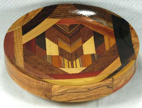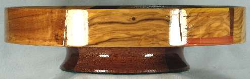 The osage orange at the top is nicely chatoyant and the 3 pieces of olive around the rim are all very nice. The one on the left side has an interesting color change along an almost-vertical line