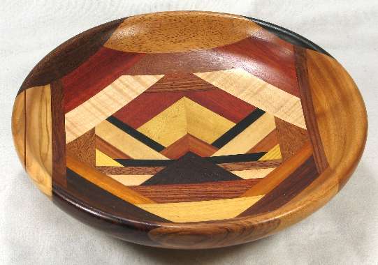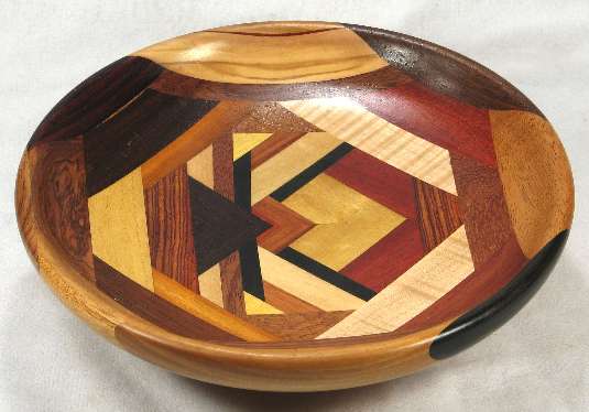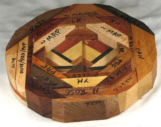 BOX: wedges up the middle are wenge, bloodwood, machiche, yellowheart, purpleheart. Up the sides are maple, sapele, Gaboon ebony, osage orange, machiche, basswood(?), Gaboon ebony