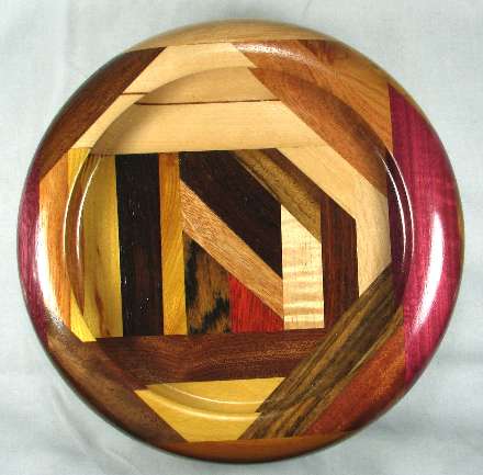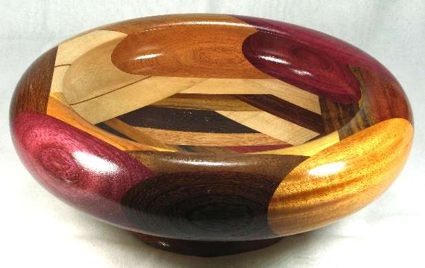 comments: This is a hefty one, and I suggest you avoid dropping it on your toe. The purpleheart in view 3 is really beautiful (compare its color to that of the piece in view 7). The canary in view 1 is nicely chatoyant, as are the two pices of birch at the outside of view 5, and the osage orange in view 4. The panga panga in views 6 and 8 both present wonderful grain patterns, as I knew they would when I selected them for the rim of this bowl.