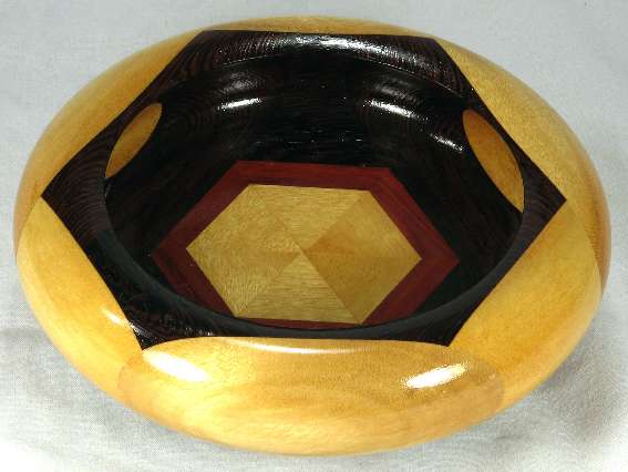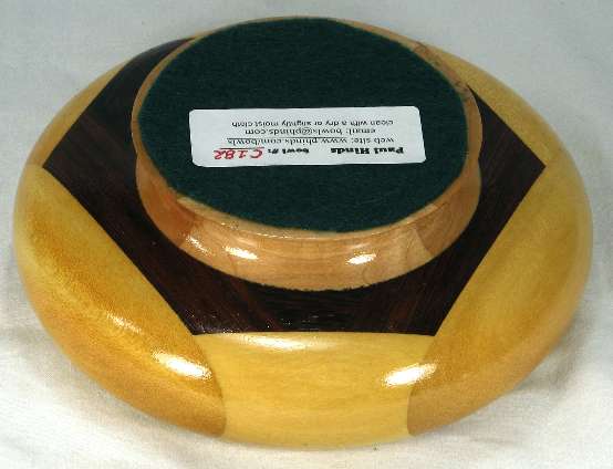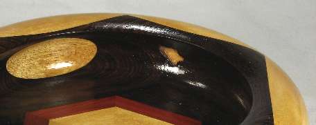 flaws/issues: the wenge inside the rim in view 4 developed an obvous chip-out. Experience told me that attempting to turn down below the chip-out was not likely to improve the situation because that piece would most likely have continued to chip out along the same edge, so I softened the edges but couldn't do much about how bad it looks. You can see it in a closeup pic down below. Too bad, to, because otherwise this bowl is really beautiful. I've reduced the price quite a bit because of the chip-out.