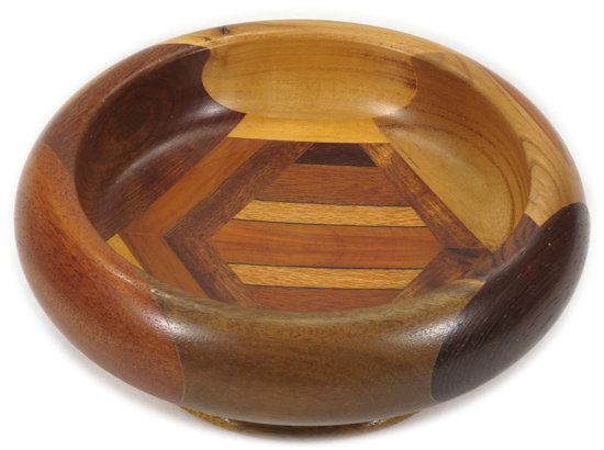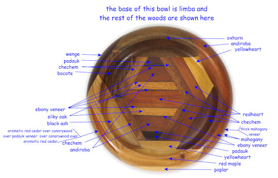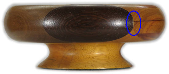 I ALWAYS POINT OUT ANYTHING THAT NEEDS TO BE COMMENTED ON. THESE ARE (UNLESS OTHERWISE STATED) THINGS THAT DO NOT DETRACT FROM THE BEAUTY OF THE BOWL, BUT I WANT TO BE SURE I GIVE A COMPLETE DESCRIPTION. SO ... There is a slight lift of the edge (due to movement in service) of the wenge in in upper left as it comes into the rim at the far left. It is quite visible due to the overlap with the next piece (shown circled in blue in one of the pics below) and you can definitely feel it with your finger tip. Although this is a single fairly minor flaw I have priced the bowl quite low because of it.