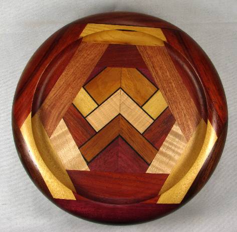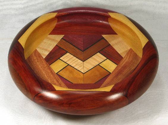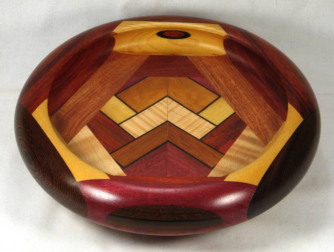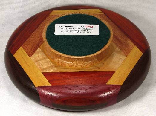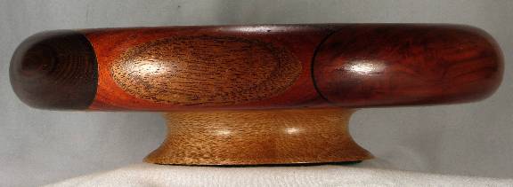 comments: symmetrical through a line up the middle, I think this is one of my better efforts. The composition of wood choices strikes me as particularly pleasing and the quality of the pieces is excellent throughout. Very nice omega curves inside the rim, and the little ebony oval inside view 5 is a particularly nice touch. I was going to turn the rim down just a little more but I so liked how that oval looked that I stopped at that point.