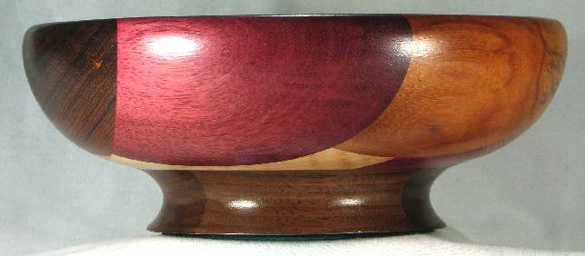 flaws/issues: The purpleheart in view 2 has a crack which you can't even see unless you really look for it. When I first saw this as I was turning the bowl, I thought I had slipped the gouge and scratched the wood, but it soon became apparent that it's a crack in the wood. Fortunately, it doesn't go through to the surface on the outside of the bowl.