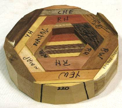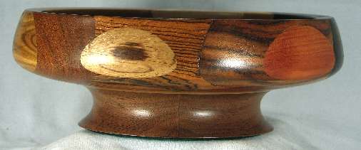 comments: The wenge in the upper left was chosen for its irregular grain and it turned out extremely well; wish I had a lot more of that. The yew at the bottom seems particularly nice to me. There are some nice omega curves inside the rim.