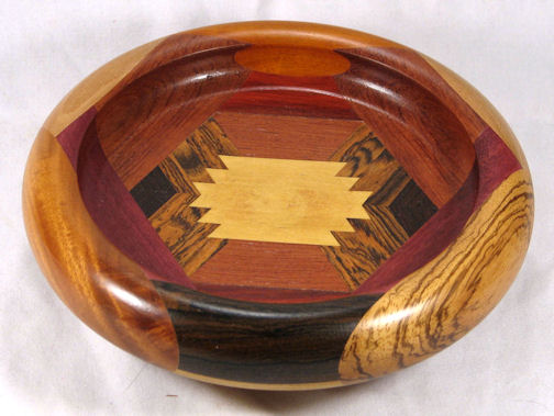 comments: This one is, in my opinion, just all-around gorgeous. There are no woods in it that are less than excellent and I think the design works particularly well. The BOX in this one was influenced by Navhoe rug designs I saw in the American Southwest in the 1950's.
